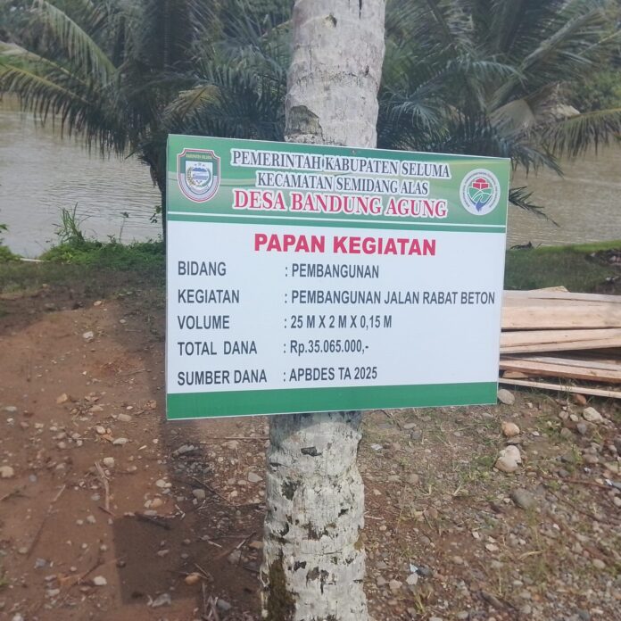 Infosiberindonesia.com Kabupaten Seluma,24 juli 2024 – Kegiatan pembangunan jalan rabat beton desa bandung agung kecamatan semidang alas kabupaten Seluma provinsi Bengkulu pada tahun 2025 dengan volume panjang 25 M lebar 2 M,tebal 0,15 terindikasi duga’an mark’up dan menggunakan material lokal/ilegal.