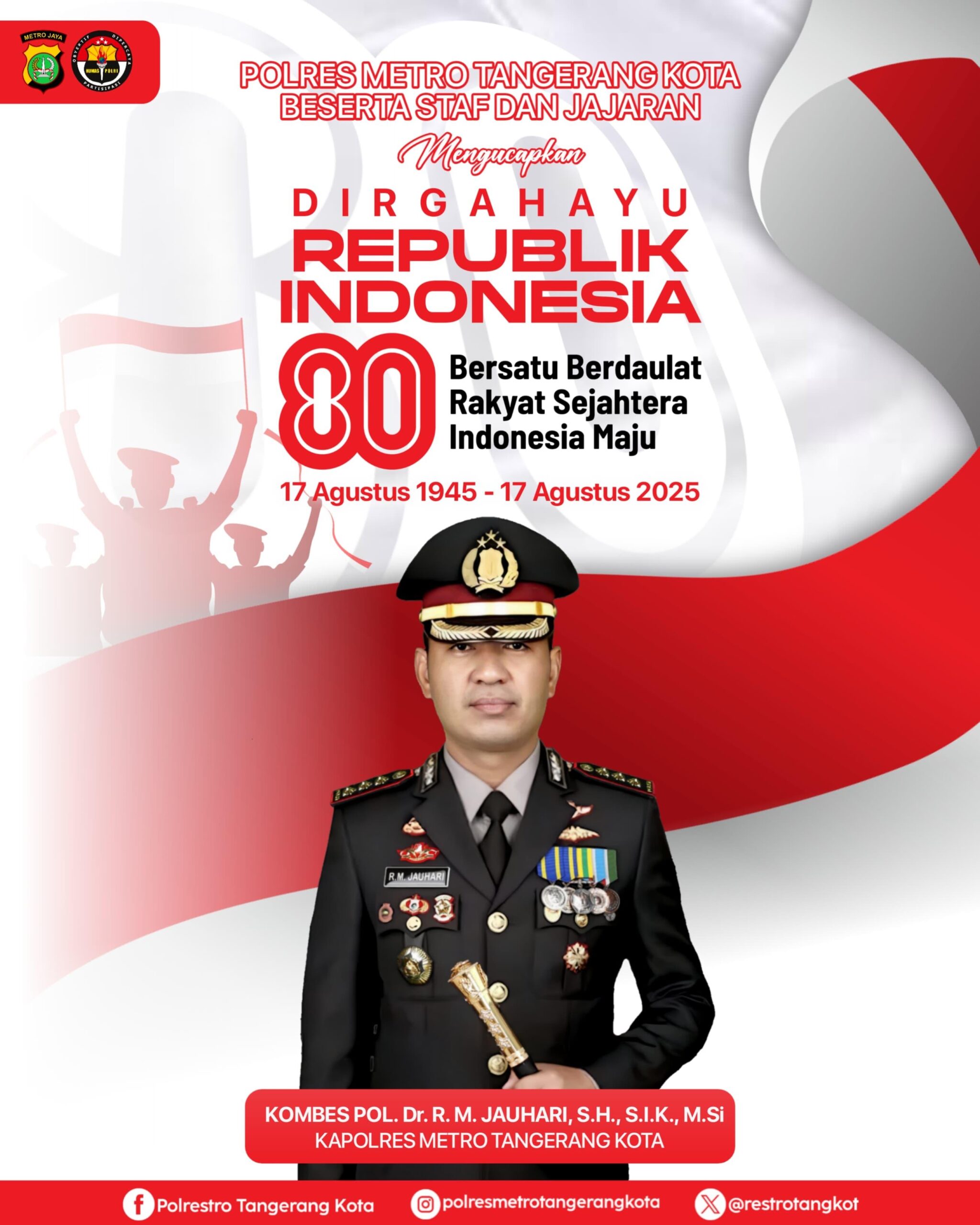 Kapolres Metro Tangerang Kota Kombes Pol.Dr.R.M. Jauhari, S.H.,S.I.K.,M.Si beserta Staf dan Jajaran mengucapkan Dirgahayu Republik Indonesia  ke- 80  dengan Slogan Mari Bersatu Berdaulat Rakyat Sejahtera Indonesia Maju.