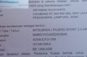 Infosiberindonesia.com Bengkulu Utara – Satu unit mobil Pajero sport warna hitam Mika bernopol BE 1259 ASB dengan nomor rangka MMBGYKG40ED023846 yang masih dalam proses Kredit di salah satu perusahaan pembiayaan PT. BCA FINANCE cabang Lampung atas nama inisial A diduga digelapkan dan diperjual belikan (7/8/2025)