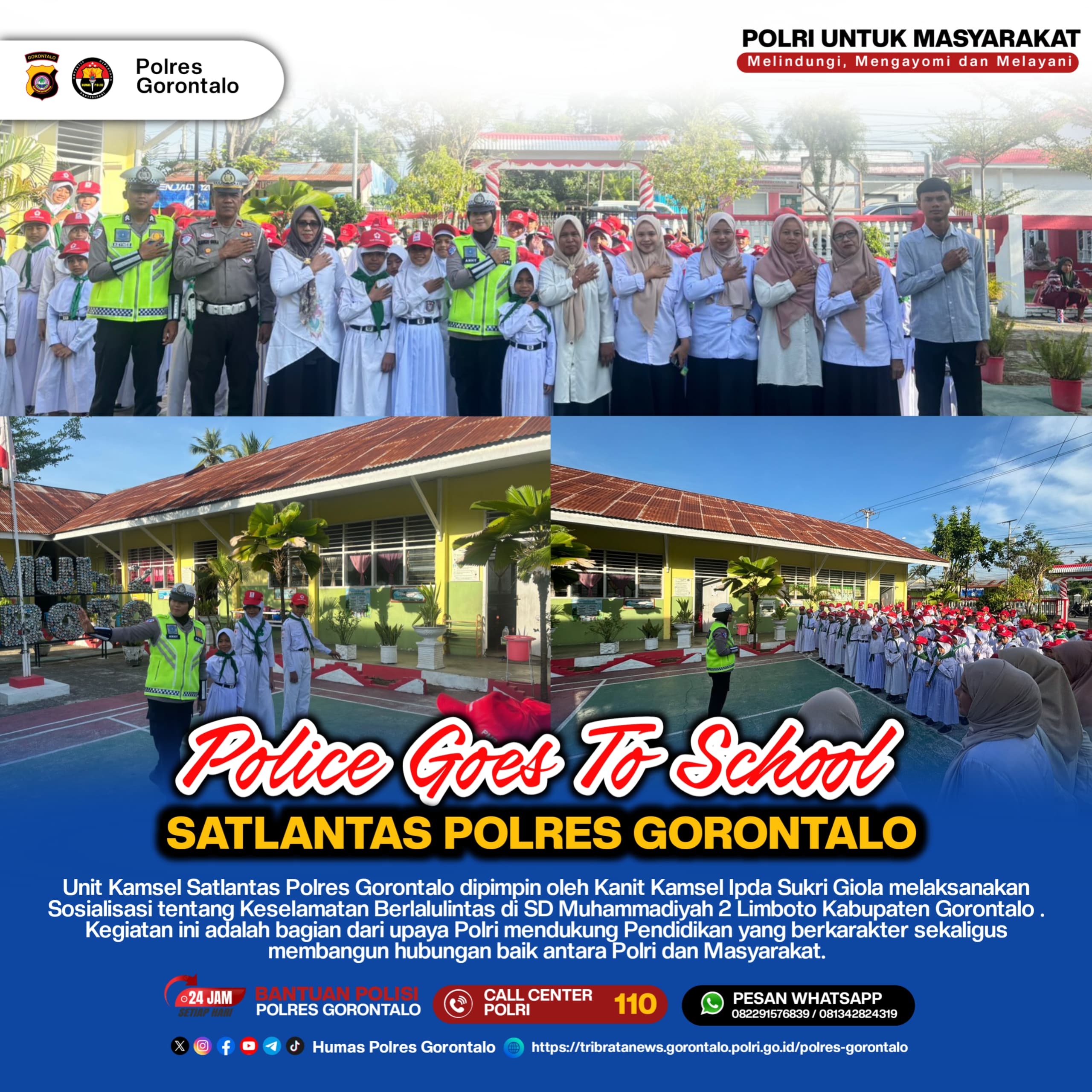 Police Goes To School : Unit Kamsel Satlantas Polres Gorontalo, Dipimpin Oleh Kanit Kamsel IPDA Sukri Giola bersama personil Anggota Lantas Polres Gorontalo, Aipda Masriani Pamu dan Briptu Riyan Keynes melaksanakan kegiatan gelar Sosialisasi Keselamatan tentang Berlalulintas, Bertempat Di halaman sekolah SDN 2 Limboto Kabupaten Gorontalo