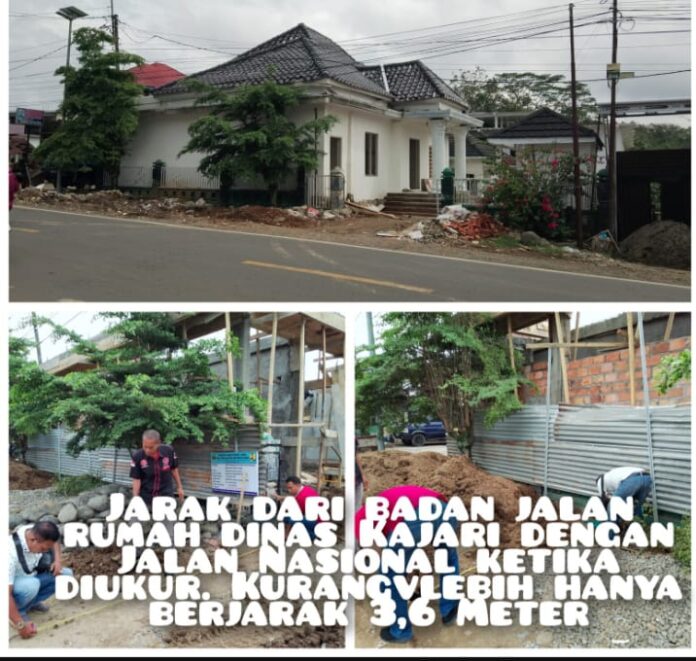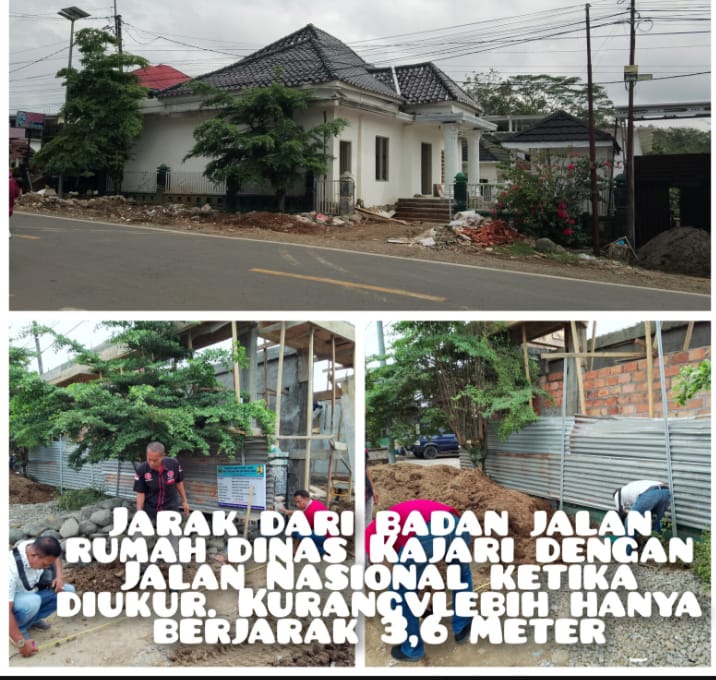 Sesuai aturan semestinya jarak pembangunan rumah dinas Kejari itu karena posisi pas berada didekat jalan nasional. Adalah 25 meter . Faktanya hanya beberapa meter saja dari bibir jalan.